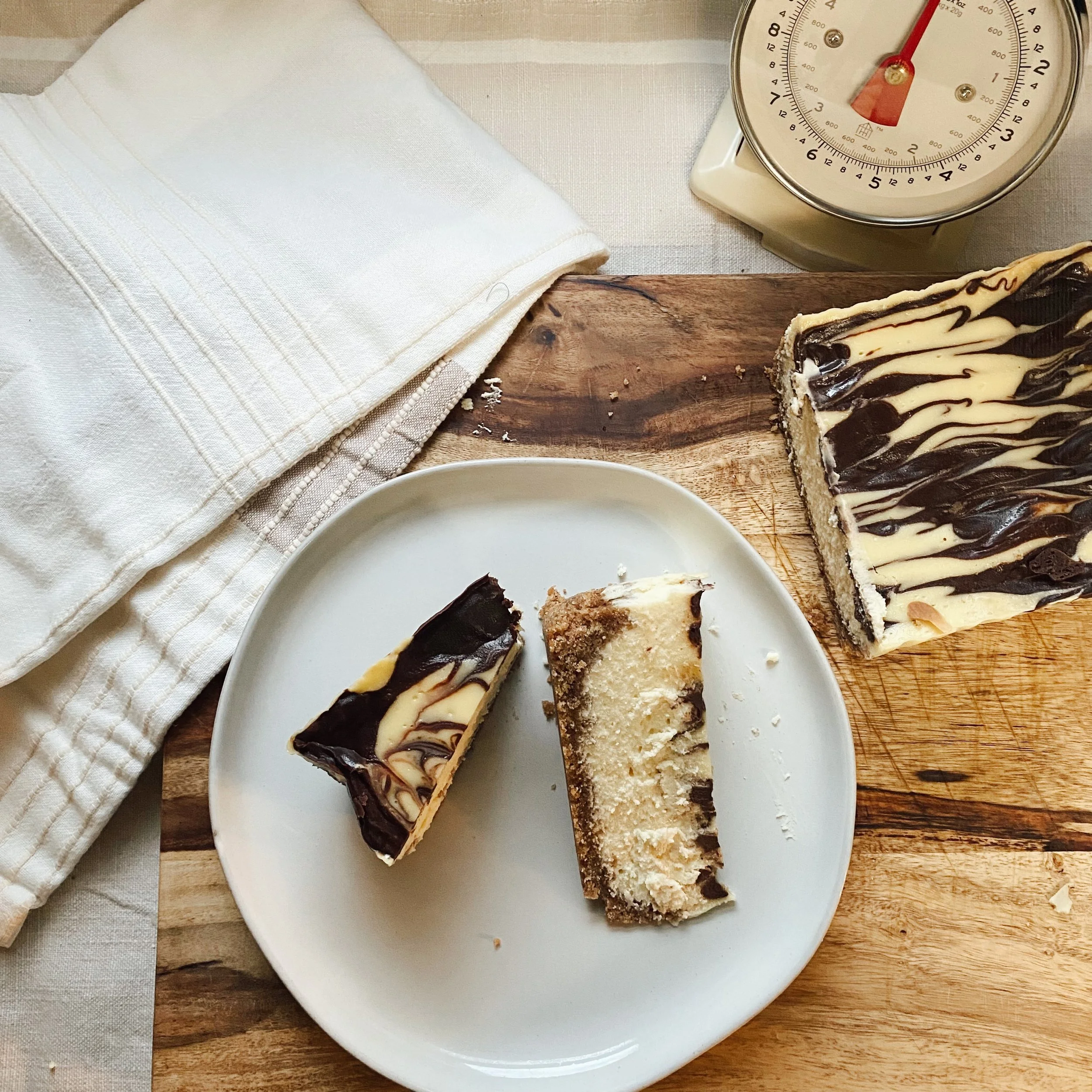Once completely cool, remove from loaf pan by using the overhanging parchment. Peel parchment from cheesecake. Slice and serve!